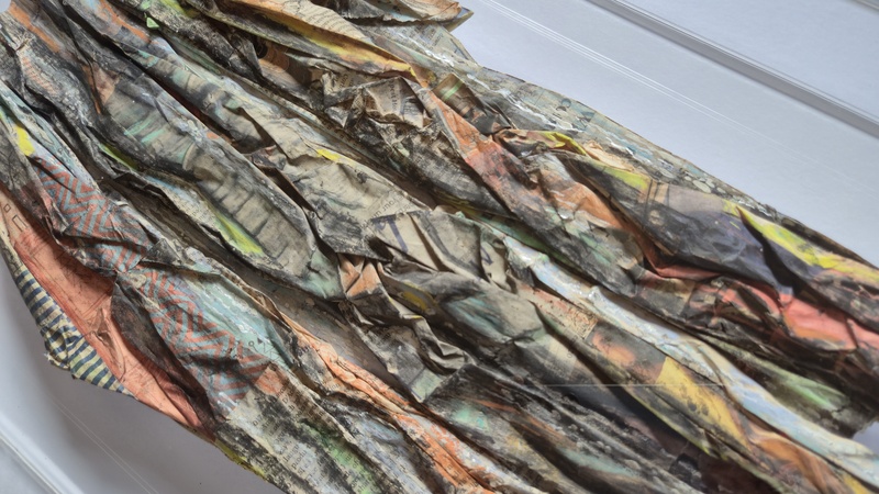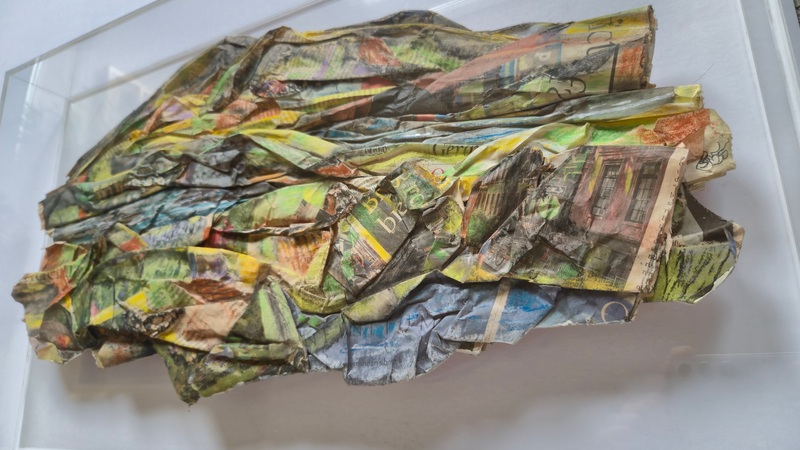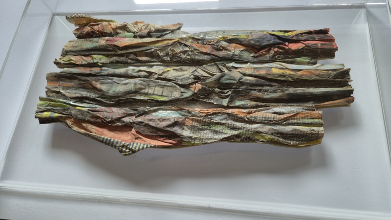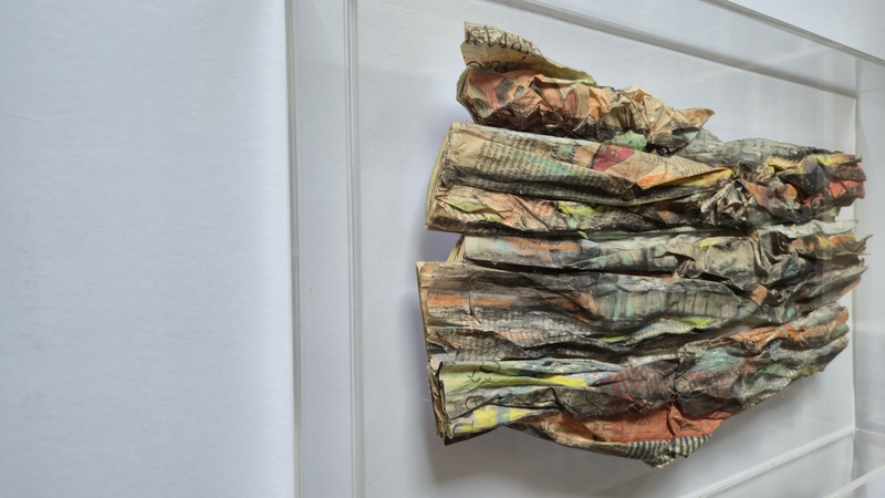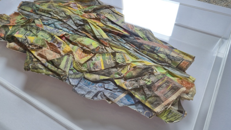 "Essence of Scotland" land and seascapes are encapsulated in large perspex sealed boxed, resonating specimens. Manipulated newspaper, coloured with pastels and charcoal, encase a specific date and political or cultural reporting, likening to fossils that can be studied to determine their place in time.